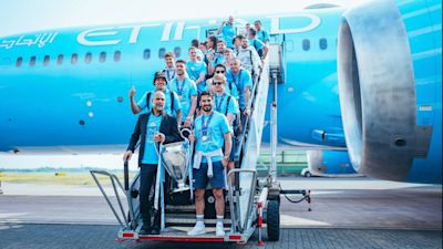A City-branded Etihad Airways plane carrying the team touched down at Manchester Airport late on Sunday afternoon.